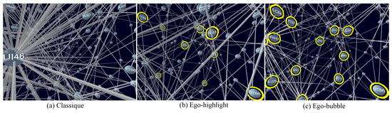 However, to get a global view of a graph, one will have to leave the egocentric mode proposed by Sorger et al, i.e., one has to move away from the graph. Some nodes will appear very distant, and therefore, it will be difficult to observe their connectivity. Thus, the egocentric approach proposed by Kwon et al. [17] seems more practical for an overall view of a graph. Indeed, with the Ego-highlight and Ego-bubble approaches, highlighting a node’s neighbors is only possible if a user takes the node’s place, whereas a graph analyst might be interested in identifying a node’s neighbors without necessarily getting close to it. In the Ego-bubble approach, edges passing close to the user are cut to avoid view obstructions. However, this can confuse a graph analyst in identifying certain connectivities if they are cut off. A node’s direct neighbors are positioned equidistant from the user in the Ego-bubble approach. However, this could cause the user to lose orientation by shifting node positions, even though Sorger et al. [21] have proposed to animate this shift when the user moves to another node.