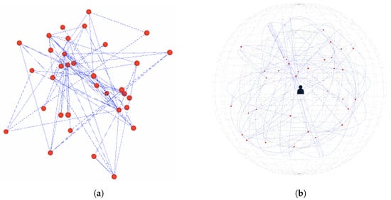 Visualization of the karate club graph (34 nodes (red dots) and 78 edges (blue lines)) [24]: (a) visualization using Fruchterman and Reingold’s algorithm; (b) our egocentric metaphor where the graph is positioned between two concentric spheres.
