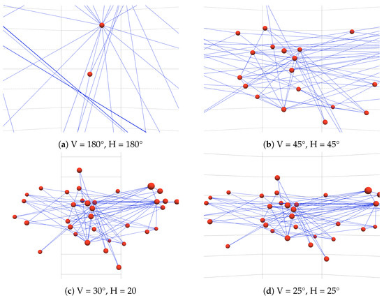 Retraction of the Spherical Bubble Space (from inside view of the user): V = angle along the vertical axis and H = angle along the horizontal axis. Red dots are the nodes of the graph and blue lines are the links between nodes.