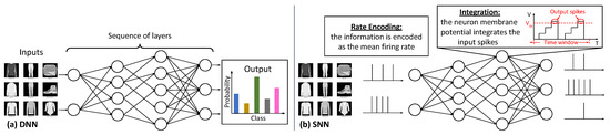 Overview of (a) the functionality of a DNN and (b) the functionality of an SNN.