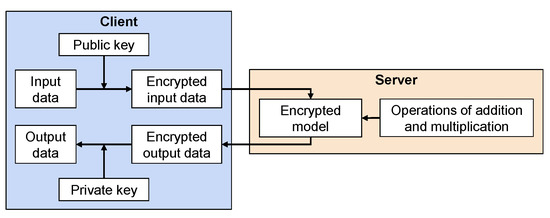 HE is a cryptographic technique that allows computations on encrypted data without decryption [28,29]. A popular scheme used in HE is the BFV scheme [10] (see Figure 3). This scheme leverages polynomial encoding to enable encrypted data manipulation. In this scheme, the client encrypts their sensitive input data using a public key provided by the server [30,31]. The server computes the encrypted data using specialized algorithms that maintain the encryption. The encrypted results are then returned to the client, who can decrypt them using their private key to obtain the desired outputs. The BFV scheme supports addition and multiplication operations on encrypted variables, preserving the algebraic structures necessary for computation. By employing this scheme, sensitive data remain protected throughout the computation process, ensuring privacy and security [32,33,34,35]. HE comes in different variants, such as partially HE (PHE), somewhat HE (SHE), and fully HE (FHE), each offering different levels of computation capabilities on encrypted data [10,36,37,38,39].