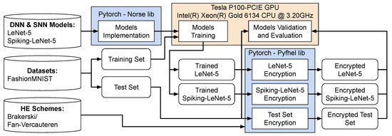 Machine learning (ML) has witnessed significant development in recent years, finding diverse applications in various sectors such as robotics, automotive, smart industries, economics, medicine, and security [1,2,3]. Several models based on the structure of the human brain have been implemented [4], including the widely used deep neural networks (DNNs) [5,6] and spiking neural networks (SNNs) [7], which emulate the functioning of neurons relatively better than DNNs [8]. These models require large amounts of data to be trained and reach high accuracy. However, if such data are collected from users’ private information, such as personal images, interests, web searches, and clinical records, the DNN deployment toolchain will access sensitive information that could be mishandled [9]. Moreover, the large computational load and resource requirements for training DNNs have led to outsourcing the computations on the cloud, where untrusted agents may undermine the algorithms’ confidentiality and intellectual property of the service provider. Note that encrypting the data transmission in the communication from client to server using common techniques such as advanced encryption standard (AES) would not solve the issues, because untrusted agents on the server side have full access to the sensitive data and DNN model. Among privacy-preserving methods, homomorphic encryption (HE) employs polynomial encryption to encrypt input data, perform computations, and decrypt the output. Because the computations are conducted in the encrypted (ciphertext) domain, the ML algorithm and data remain confidential as long as the decryption key is unknown to the adversary agents. However, common HE-based methods focus on traditional DNNs, and studying the impact and potential of encryption techniques for SNNs is still unexplored.
