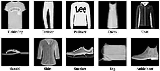 FashionMNIST [40] (see Figure 5) is a widely used dataset in computer vision and machine learning. It serves as a benchmark for image classification tasks and is a variation of the classic MNIST dataset. Instead of handwritten digits, FashionMNIST consists of grayscale images of various clothing items, such as shirts, dresses, shoes, and bags. It contains 60,000 training and 10,000 testing samples, each a 28 × 28 pixel image. The dataset offers a diverse range of clothing categories, making it suitable for evaluating algorithms and models for tasks such as image recognition, object detection, and fashion-related applications. FashionMNIST provides a challenging yet realistic dataset for researchers and practitioners to explore and develop innovative solutions in computer vision.