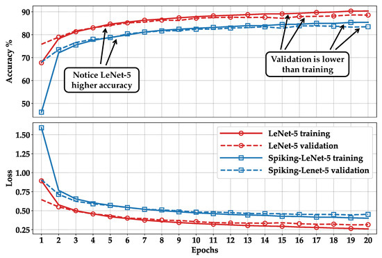 Figure 7 shows the accuracy and loss during training, comparing the LeNet-5 CNN with Spiking-LeNet-5 and their respective validation values at each epoch.