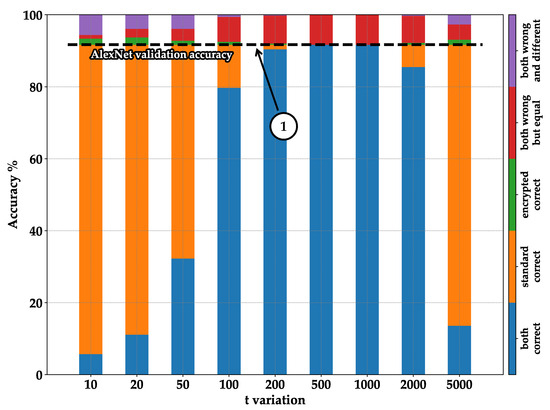 - Orange—standard correct: represents the case where images are classified correctly in the standard execution but not in the encrypted one. It can be observed that by summing the blue and orange columns, we always obtain the same result: the accuracy of validation during training (see pointer ➀—Figure 8, Figure 9, Figure 10 and Figure 11);