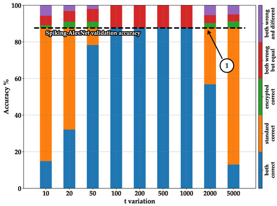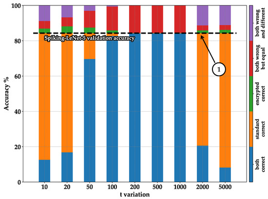 On the contrary, in Figure 13 and Figure 15, we compared the sums of the blue and red parts from Figure 8, Figure 9, Figure 10 and Figure 11. In this manner, we can observe all the cases where the encrypted version produced the same result as the standard one, even if it was incorrect (see pointer ➁— Figure 13 and Figure 15). From this graph, we can notice that the encrypted version of the Spiking-LeNet-5 model performs better than the encrypted LeNet-5, and the encrypted Spiking-AlexNet performs better than the encrypted AlexNet. The SNNs achieve valid results with lower values of t (see pointer ➀—Figure 13 and Figure 15) and higher overall accuracy. For excessively high values of t, the results degrade for both the DNN and SNN models due to the increased computational complexity, which hinders the attainment of acceptable outputs (see pointer ➂—Figure 12, Figure 13, Figure 14 and Figure 15).