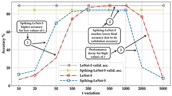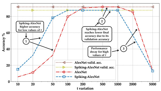 It can be noticed that for both low and high values of t, the results degrade rapidly. For a better understanding, let us compare LeNet-5 with Spiking-LeNet-5 by looking at Figure 12 and Figure 13, and AlexNet with Spiking-AlexNet in Figure 14 and Figure 15, where the accuracies are graphically displayed as t varies.