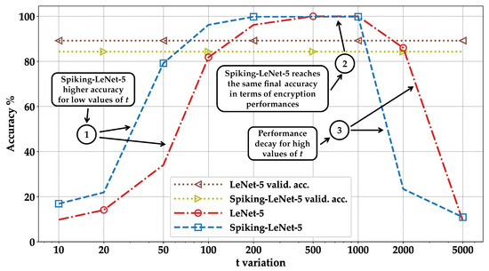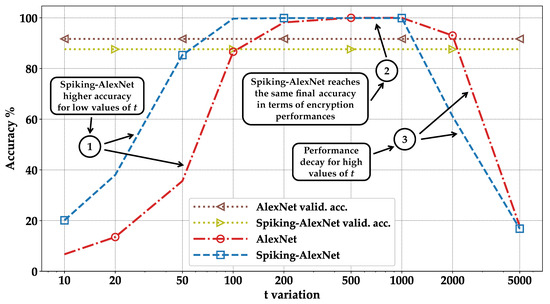 In Figure 12 and Figure 14, we compared the LeNet-5, Spiking-LeNet-5, AlexNet, and Spiking-AlexNet models in the case where both the standard and encrypted models were correct, representing the graphical representation of the blue parts of Figure 8, Figure 9, Figure 10 and Figure 11. As can be seen, the Spiking-LeNet-5 version achieves acceptable levels of accuracy much earlier than LeNet-5, even with low values of t (see pointer ➀—Figure 12). For instance, when t = 50, Spiking-LeNet-5 achieves about 40% higher accuracy than LeNet-5. However, the final accuracy of the Spiking-LeNet-5 model is slightly lower than that of LeNet-5 (see pointer ➁—Figure 12); this can be attributed to the fact that the Spiking-LeNet-5 model itself had lower validation accuracy compared to LeNet-5, as shown in Figure 7. Similar observations can be derived by comparing AlexNet with Spiking-AlexNet. Spiking-AlexNet reaches higher accuracy than the AlexNet for low values of t (see pointer ➀—Figure 14), but for larger t, the accuracy of AlexNet is slightly higher than that of Spiking-AlexNet (see pointer ➁—Figure 14).