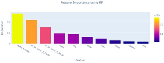 Feature importance analysis utilizing Random Forest is an effective method for determining the significance of various features of the BoT-IoT dataset. This analysis reveals which characteristics have the greatest impact on the dependent variable. Thereby facilitating the identification of critical factors that contribute to the behavior of the attack that compromised the IoT devices, as shown in Figure 2.