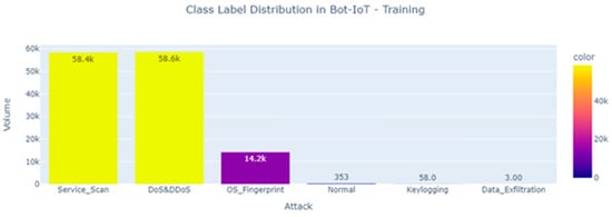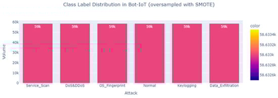 Attack class distributions after oversampling the BoT-IoT dataset using the SMOTE algorithm.