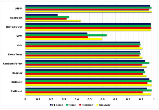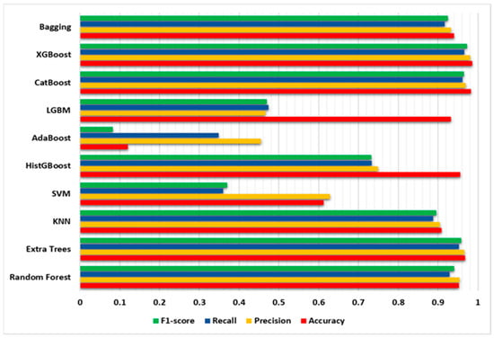 On the other hand, the application of SMOTE altered the performance of some classifiers significantly. In Table 3 and Figure 10, MLP, ANN, LSTM, and GRU models exhibited lower accuracies, precision, recall, and F1-scores than they did in Table 2. This suggests that even with SMOTE, these classifiers cannot be as effective when dealing with imbalanced datasets. However, it is important to note that these models still obtained a respectable level of accuracy and other metrics. In addition, classifiers such as Bagging, Random Forest, Extra Trees, KNN, and LGBM showed consistent performance across both tables, demonstrating their robustness in dealing with imbalanced datasets. While the accuracies and F1-scores remained relatively stable, the application of SMOTE marginally improved the precision and recall values for these classifiers.