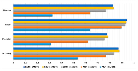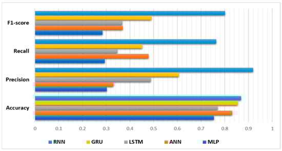 The performances of the LSTM, GRU, and RNN models, as shown in Figure 8, were superior to those of the MLP and ANN models. The LSTM model obtained an accuracy of 0.83418, along with precision, recall, and F1-scores of 0.755, 0.927, and 0.77, respectively. The GRU and RNN models exhibited comparable performance, with accuracies of 0.878 and 0.87, respectively. However, all three models required highly training periods of approximately 30 min, and their model sizes are larger at 7.69 MB.