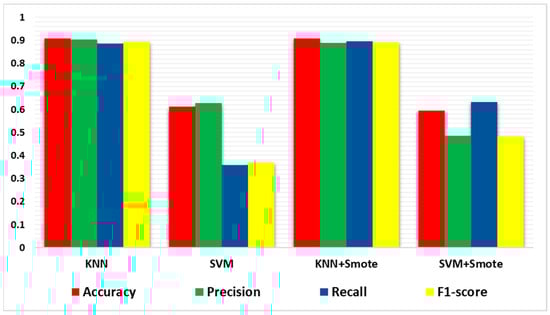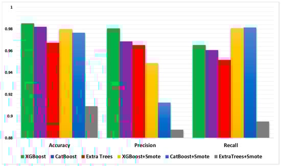 In contrast, the comparison between deep learning models’ performance with and without using the SMOTE algorithm is shown in Figure 9. Comparing the two tables reveals that the SMOTE algorithm has affected the performance many different classifiers. From Figure 9, CatBoost and XGBoost, which performed exceptionally better (as shown in Table 2), maintained their high accuracy and obtained competitive precision, recall, and F1-scores, as shown in Table 3. This indicates that these classifiers are robust and that the use of SMOTE has minimal effect on their efficacy.