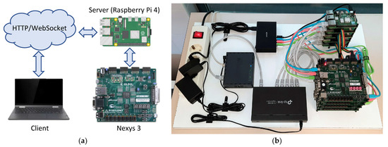 Figure 1 provides an overview of the architecture of the remote laboratory and shows an image of the system. The server consists of a cluster of Raspberry Pi 4s connected to Nexys3 boards, which can be easily scaled if necessary.