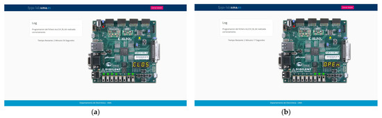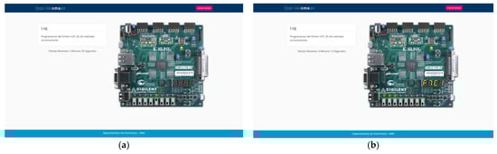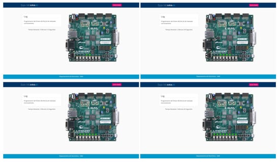 In recent years, the teaching of electronics has seen a significant increase in the availability and variety of remote laboratories [6,7,8]. The need for these resources is evident in off-campus learning [9,10,11], while in on-campus teaching, they become a viable option to meet the growing demand for laboratory resources beyond regular class hours, which are often very limited. A great variety of remote laboratories were proposed [12,13,14,15,16,17,18,19,20,21]. In this context, the authors developed their own remote laboratory (RLAB). Its main feature is that it does not need a webcam for its operation. This allows the users to verify their designs remotely on the real hardware, even if they do not have a broadband connection capable of supporting real-time video transmission. The initial version, based on Arduino, was introduced in [22], and subsequent improvements were made since then, including a migration to a system based on a Raspberry Pi 4. This web-based application enables users to remotely configure an FPGA-based development platform that has a wide range of peripherals, and allows interaction with these components in order to facilitate design debugging and testing, mirroring the experience of working directly on campus.