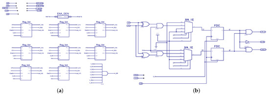 Figure 7. VOT_RL project, MyDesign sub-modules: (a) Regs_Vot schematic diagram; (b) Reg_Vot state machine schematic diagram. - Integrate the ModCV module with the other modules in the project.