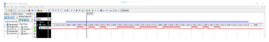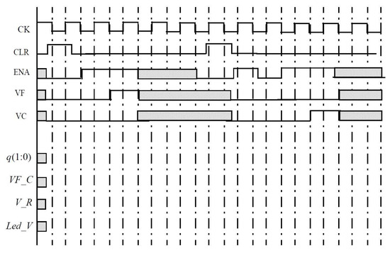 They also should simulate the Reg_Vot module and show its behavior using a timing diagram for a given input sequence. An example of a chronogram with a test sequence is provided to help students write an appropriate test vector file to simulate the behavior of the block (Figure 8). In this figure, CLR is the clear input signal of the system, ENA is the enabling/selection input of the Reg_Vot module, and VF and VC are the inputs that indicate the vote (for or against), respectively. The output signals q(1:0) are a bus that represents the current state of the state machine, VF_C is the output that records the vote (VF_C = 0 against, 1 for), V_R is the signal that indicates whether the vote was finally taken or not, while Led_V is a signal that visualizes the voting process, as indicated above. After carrying out a previous analysis, the student must complete the chronogram in Figure 8 and verify that the chronogram resulting from the simulation coincides with the expected one.