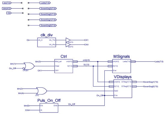 The main idea is to generate different sequences of output patterns from a five-bit binary counter output (cb5c block, five-bit counter, in the Ctrl module in Figure 10b), which can be selected using a Nexys3 button. Different patterns can be considered, e.g., stand_by (ST_BY module), road_widening (Sh_OpenM), road_narrowing (Sh_CloseM), and SOS Morse code (SOS_MC). All these signals can be implemented by making the Nexys3 LEDs shift or blink in a periodic sequence following the selected pattern. Another two-bit counter (CB2CE, from the Xilinx digital library in the Ctrl module in Figure 10b) is used to select one of four visualized signals. The last counter is controlled by a button in Nexys3 (Nivel_a_Pulso block in Ctrl module is in charge of synchronizing the button). The MSignal module also includes basic combinational blocks as a D2_4E decoder and M4_1E 4x1 multiplexer for eight-bit buses, both from the Xilinx digital library).