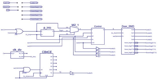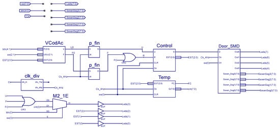Note that the Door_SMD module is also used in these projects to emulate the opening and closing action of the door, whose status is visualized in the seven-segment displays and LEDs of the Nexys3 platform. Note also that P_fin modules in Figure 15 generate a one-clock cycle synchronous pulse from their own level input signal from VCodAc module. The TEMP module, meanwhile, is a timer that generates an FC final count signal to reset an opening or closing sequence when a time limit is reached without completing the sequence.
