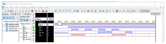 In Figure 14, after CLR (active low pulse), the door is open (S, low), and after one clock cycle, automatic mode is activated (A, high) and remains high all the simulation time. Then, two P pulses arrive while DP is low, so the first P pulse closes the door (S goes high), and the second one opens it (S goes low again). When a new P pulse arrives, DP is also active (DP high), so the door remains open. The following P pulse closes the door because now DP is low again. Finally, a new activation of DP does nothing because the door is already open.