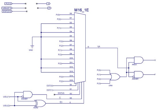 Figure 16 shows how the VCodAc combinational module was implemented in this project. Note that the enable and control signals in multiplexer M16_IE from the Xilinx library (E, and (S[3:0], respectively) come from the user selection signals (USU[1:0]) and the state of the control machine (EST[3:0]), while the mux inputs (D[15:0]) come from the pushbutton. Validation output signal V is therefore only active when the expected button is pressed in the corresponding state of the state machine.