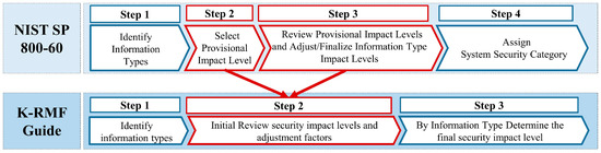 In the trend of global digitization, efforts to implement the RMF have been consistently made by the K-MND after the signing of a cybersecurity cooperation agreement with the U.S. The RMF has been regarded as a key element for effectively responding to cyber threats and safely operating the main defense systems. However, the detailed methodology, particularly for the national security system (NSS), has not been disclosed, posing challenges to the detailed application of the RMF in Korea’s defense system. To effectively apply the RMF to major defense systems, the K-MND developed a methodology focusing on the initial two stages of the RMF process mentioned in Section 2.1.
