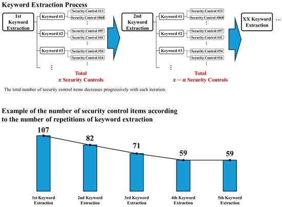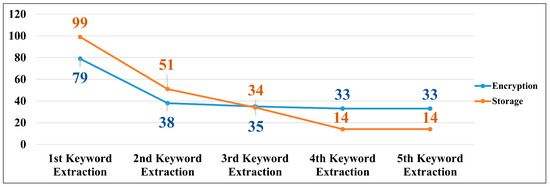 After extracting the main keywords, detailed keywords related to them are extracted. Through the process depicted in Figure 2, security control items are searched and then extracted as shown in Table 13. Table 13 displays the number of security control items derived from repeated extractions of the keyword ‘encryption’. Similar procedures were conducted for other keywords. The classification code for the security control item is based on NIST 800-53, and one can observe how access control (AC) and system and communication protection (SC) change each time a keyword is repeatedly extracted. Such repetitive extractions continued until no more security control items could be added. This process was conducted under the approval of the security authority. In total, the keyword extraction was repeated five times, resulting in 33 security control items for the ‘encryption’ keyword. The keyword ‘storage’ was repeated five times, resulting in 14 security control items, as shown in Figure 6. After extracting security control items for other keywords and removing duplicates, 44 items were identified. Combining these with the items derived from Table 11 resulted in a total of 456 security control items.