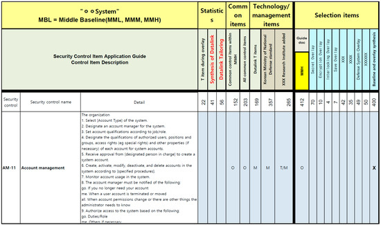 Subsequently, the results of adjusting the security impact level are represented in Table 11. Considering the small operational scale of the system to which the RMF is applied, and the characteristics of the information classified as a level 2 secret, the ‘Defense networks’ category was adjusted from ‘High’ to ‘Medium’ in the C and I sectors. However, considering the time-sensitivity of information access, the A sector remained ‘High’. Similarly, the ‘Defense System Integration’ category was adjusted from ‘High’ to ‘Medium’ in the C and I sectors but remained ‘High’ in the A sector. On the other hand, categories like ‘Data Exchange’ retained their initial ‘Low’ classification across all sectors. Consequently, after adjusting the information type of the K-MND’s OO system as in Table 11, the items were adjusted from the original 445 to 412, and the HWM’s security impact level for C, I, and A was adjusted to M, M, and H, respectively.