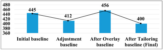 Applying the tailoring described in Section 3.2 to the OO system, out of the 456 security control items identified through the overlay, 56 were optimized through tailoring, leaving 400 security control items selected in the end. This showcases how tailoring can optimize security measures in line with an organization’s specific characteristics and requirements. The process of modifying the security control items proceeded from the ‘Categorize’ phase to the ‘Select’ phase, with the results visually presented in Figure 7. The baseline security control items initially set numbered 445. However, the first review reduced this by 33 based on specific conditions and requirements, bringing the count down to 412. Subsequent overlay processes added 44 more, totaling 456. Finally, considering the actual environment and requirements of the organization, tailoring further optimized 56 items, leaving 400 in the end.