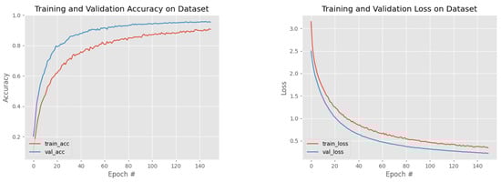 Figure 4(left) gives the model accuracy on the training and validation datasets. As we can see, the accuracy increased quickly in the beginning and increased steadily after 40 epochs. We were able to achieve 95.31% accuracy with the validation dataset, whereas with the training dataset we achieved 90.61% accuracy. Again, Figure 4(right) gives information on model loss on training and validation datasets. We used the categorical cross-entropy loss function. This means we trained the model to provide probability over all classes for each image that is going to be predicted. As seen from the graph, the loss dropped quickly in the initial epochs and with each epoch the loss reduced. The model had 0.37% training loss and 0.25% validation loss.