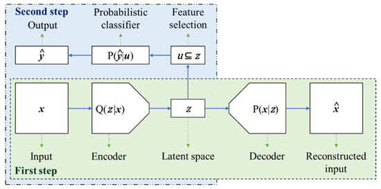 Simplified overview of the proposed methodology, composed of two main steps: The first step develops the VAE, whose encoder was then used for feature creation that fed the classifier created in the second step.