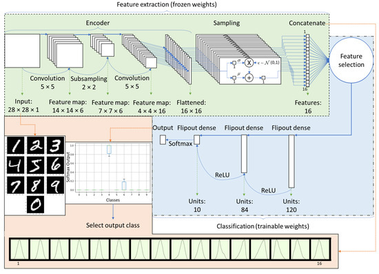 Structure of the classifier used for the classification analysis. The feature extraction part comprises the encoder developed by the VAE, and the weights of this part were frozen (non-trainable). A feature selection procedure was employed for the classification, and the classifier’s weights were optimized using supervised learning.