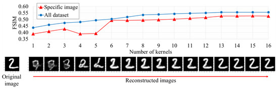 Variation of the FSIM as the kernels selected by KLDS is progressively used (one by one), from more to less relevant. The image also displays the FSIM variation for a specific example (original image) and the progression in the reconstructed images as the number of used kernels increases.