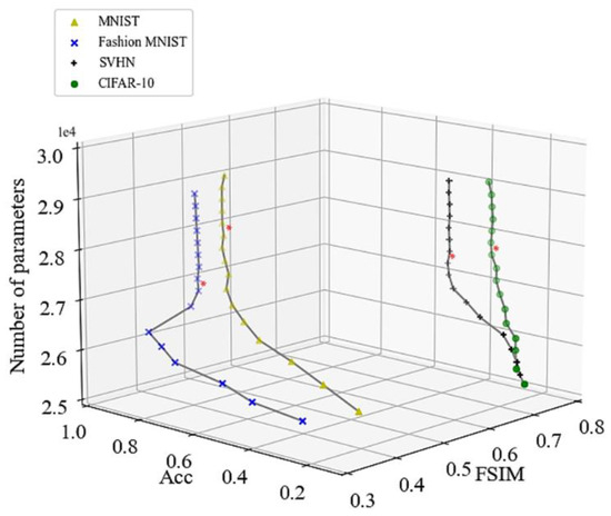 Variation of the Acc and FSIM as the used kernels, whose sequence was selected by KLDS, is progressively increased (leading to an increase in the number of parameters of the model) for the four examined datasets. The asterisk indicates when variation in both metrics is lower than 1%.