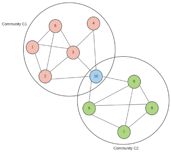 An example of two overlapping communities. Node 10 belongs to both communities.