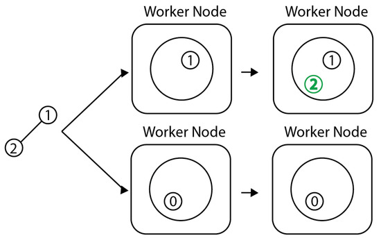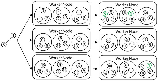 where the term represents the average number of communities per worker node, ensuring an approximate load-balancing split. We can consider the acting as an adjustment term that allows for slight variations for balancing the load. This term may depend on various factors, such as the computational power of each worker node (case of heterogeneous worker nodes). For our approach, we assume that all worker nodes are homogeneous, i.e., have the same computational power and hardware; thus, the term is set to zero for all workers . In this case, the maximum number of communities processed by each worker is at most .