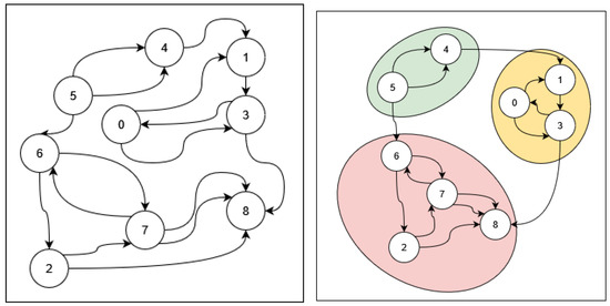In this section, we present the basic definitions and notations. A graph is a set of nodes and edges, , where V is the set of all nodes in the graph and E is the set of all edges. Graphs are very versatile and can be used to represent any number of complex ideas in an easy-to-parse data structure, from geographical layouts to complex interactions in social media networks. A subgraph is a graph made of a subset of the nodes and edges of another graph. Given a graph and a subgraph of G, then both and are true. A community is a subset of nodes from a graph that are densely connected to each other and weakly connected to the rest of the graph. Community detection is the process of attempting to group nodes of a graph into communities; see Figure 4 for an example. Initially, no communities are found, as shown on the left side of Figure 4. The right side of Figure 4 captures the situation after discovering the three communities, which are grouped together in ovals with different colors, and are , , and .