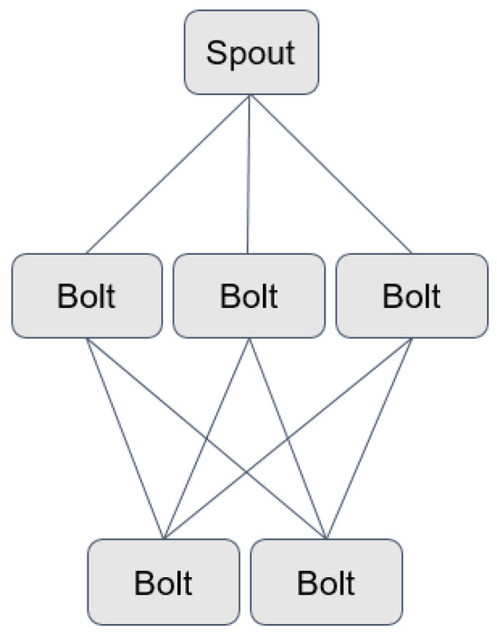 We use the Apache Storm Java framework for distributed processing using streams maintained by Twitter and the Apache Foundation. Storm abstracts the distribution and passing of messages between compute nodes. The basic data type of the Storm distribution is a Tuple, and there are two types of processing nodes: Spouts and Bolts. A Tuple contains any number of supported data types. Tuples natively support all primitive data types, as well as Strings and byte arrays. Tuples can also support custom data types if those data types implement a serializer and register that serializer with Storm. A Topology is a construct that contains all the information about the particular setup for a given Storm program. The Topology is what is submitted to an Apache Storm cluster and contains the code that computation nodes execute, as well as how the messages are distributed between nodes and which nodes listen to each other. A Topology will run indefinitely until the user stops it or submits a new Topology to the Storm cluster. One of the two main components of an Apache Storm Topology is a Spout. A Spout is responsible for creating a stream of Tuples that are then emitted to the rest of the Topology. The Topology itself takes care of how those Tuples are distributed. Spouts cannot receive Tuples from any other processing nodes, only create and emit them. The other main component of an Apache Storm Topology is a Bolt. Bolts are typically the nodes that conduct the actual processing of the Topology. Bolts receive the Tuples emitted from Spouts or even other Bolts, and conduct some kind of processing on them. Bolts can emit their own Tuples for consumption by other Bolts. Apache Storm’s Local Mode simulates distributed computing using multi-threading, allowing an Apache Storm cluster to run without the need for multiple systems. An example of an Apache Storm Topology (in which there is one spout, three bolts that listen to the output of that spout, and two additional bolts that listen to the output of the three previous bolts) is shown in Figure 6.