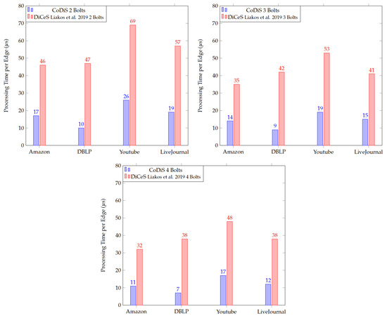 Figure 7 shows the average time per edge for CoDiS and DiCeS [8] at different worker node counts. Across the board, there was a significant decrease in time when running CoDiS as opposed to DiCeS [8]. The average decrease in processing time is 3.34 times faster than DiCeS [8]. At 2 bolts, the speedup is 3.26 times greater, at 3, it is 3.17 times greater, and at 4, it is 3.58 times greater.