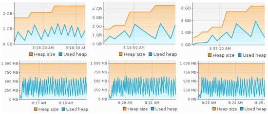 Top: The memory usage of CoDiS at (left to right) 2, 3, and 4 Bolts. Bottom: The memory usage of DiCeS [8] at (left to right) 2, 3, and 4 Bolts.