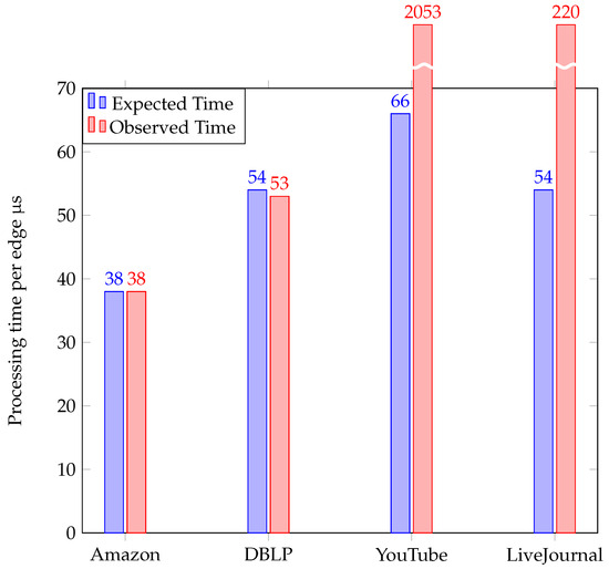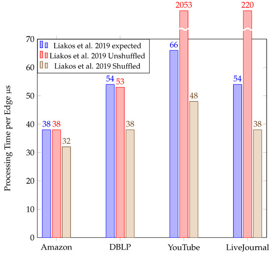 When running the source code for [8] on our test system, which uses a much faster CPU, we found that it only took 38 s on average to process an edge for the Amazon dataset. If the times followed the same scaling as in [8], we would expect the time per edge of the DBLP dataset to be s, which is almost exactly what we saw when actually running it on our machine.