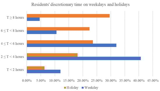 Figure 5 displays the percentage of residents’ average discretionary time on weekdays and holidays. The figure reveals that the majority of residents have 2 to 6 h of discretionary time on weekdays and 4 to 8 h on holidays. This indicates that during holidays, residents have more time available for non-work activities, such as leisure and recreation.