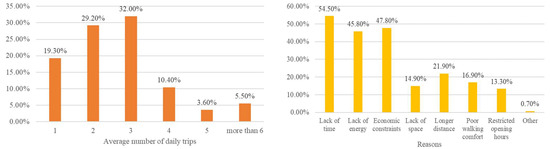 Figure 6 provides insights into the average number of daily trips made by residents for their daily activities, along with the distribution of reasons hindering their walking trips. The data illustrate that a significant proportion of residents typically make up to three daily trips. Notably, the factors with the most substantial influence on hindering walking trips are identified as lack of time, lack of energy, and limited economic conditions.