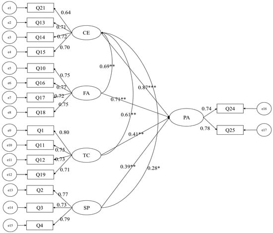 Based on the correlation analysis and model path adjustment, a total of seven paths are identified: CE → PA, FA → PA, TC → PA, SP → PA, FA → CE, TC → CE, and SP → CE. The factors influencing perceived accessibility are ranked in descending order as follows: travel experience, facilities, traffic condition, and safety perception, with their corresponding coefficients shown in Figure 7.