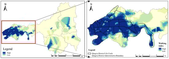 In this study, the single-point walk score of Qingxiu District is calculated using ArcGIS, and the findings are visually presented in Figure 8.