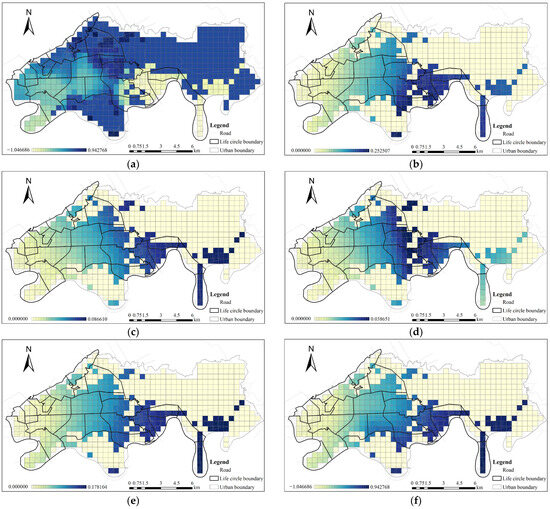 Figure 9e shows that the coefficient of residential land use in the MGWR model has a mean value greater than 0. The more concentrated the residential communities near Vientiane, National Avenue, the southeast area of Xianghu Avenue Interchange, and the eastern part of Xianghu Avenue, the higher the coefficient value and consequently, the better the walkability. However, it is essential to be cautious about the potential impacts of overconcentration of population on both society and the environment.