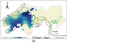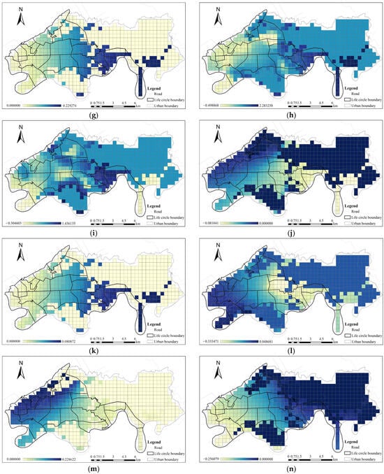 Figure 9m illustrates the distribution of the regression coefficients for the degree of land use mix, and it shows a positive effect. This positive relationship implies that higher degrees of land use mix in an area, characterized by a diverse mix of service facilities, contribute to improved walkability. The areas with larger coefficient values are concentrated in the northwest corner, which corresponds to the old urban area of Qingxiu District. This area is well-planned and equipped with various facilities, further enhancing its walkability.