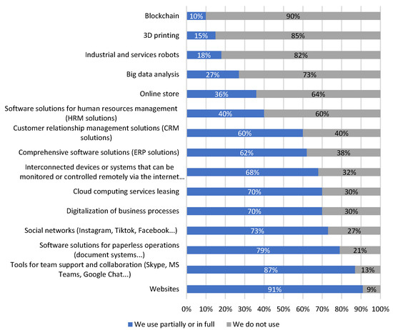 As noted in the Introduction, digital transformation encompasses the development and adoption of various technologies. In our research, we examined which technological solutions have been employed by the companies. Respondents had the option to choose from 15 different technologies and mark all of the ones they use (Figure 1). The results indicate that the companies predominantly utilize simple, widely accepted, and long-standing technological solutions, such as websites (91%), tools for team support (87%), paperless business programs (79%), and social networks (73%). On the other hand, advanced or newer technologies like blockchain (10%), 3D printing (15%), and industrial and service robots (18%) were least represented among the companies’ responses.