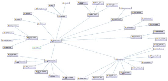The prototype’s design incorporated key components such as data sources, a data integration layer, and a logical inference engine. The ontological framework was built using semantic OWL language and descriptive logic, facilitating complex querying and formal reasoning [,,]. Given that the study focuses on crime scene analysis, the ontology was populated with entities and relationships most relevant to this context, such as types of evidence, crime scenes, suspects, and investigative actions. The prototype was designed to be highly modular, allowing for future expansions or modifications, such as adding additional data types or integrating more advanced reasoning algorithms. A case study was then conducted to evaluate the prototype, using both simulated and real-world scenarios to assess its ability to integrate diverse data sets and generate meaningful insights.