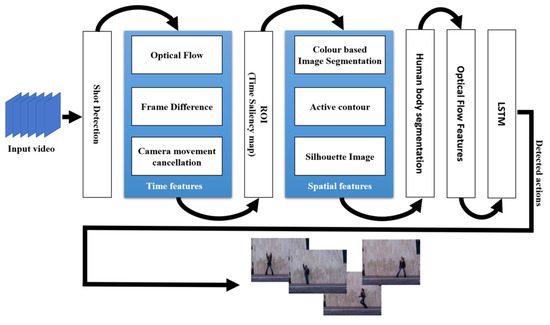 The proposed method focuses on preprocessing to compensate for camera movement, sensor movement, and scene movement before DNN. Some steps of the proposed method are based on modifications of previous studies. These parts are shot detection to detect sudden changes in the scene during action detection, camera movement cancellation to separate the motion of the objects of interest from the movement of the camera, optical flow computation, silhouette image extraction, and active contour and colour-based image segmentation.